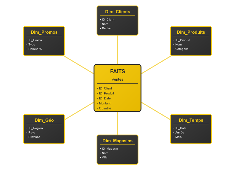 Le schéma en étoile ci-dessous est l’approche de modélisation la plus couramment adoptée dans les entrepôts de données où sont reliées entre elles tables de faits et tables de dimensions.