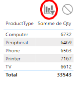 Les filtres croisés : chaque visuel d’une page de rapport agit par défaut comme filtre des autres visuels de la page. C’est la grande force de Power BI par rapport à Excel qui oblige à créer des segments spécifiques pour trier les tableaux et les graphiques croisés dynamiques. Dans Power BI on peut donc concevoir les visuels d’une même page pour qu’ils puissent se filtrer les uns les autres sans utiliser le volet Filtres ni de mesures complémentaires. Dans notre exemple, il suffira donc de créer un visuel quelconque croisant les Produits et les Quantités puis un autre visuel contenant uniquement les Produits pour filtrer le premier sur le seul Produit A. Les interactions entre chaque visuel d’une page peuvent être modifiées une à une grâce au premier bouton Modifier les interactions du ruban horizontal du menu Format .